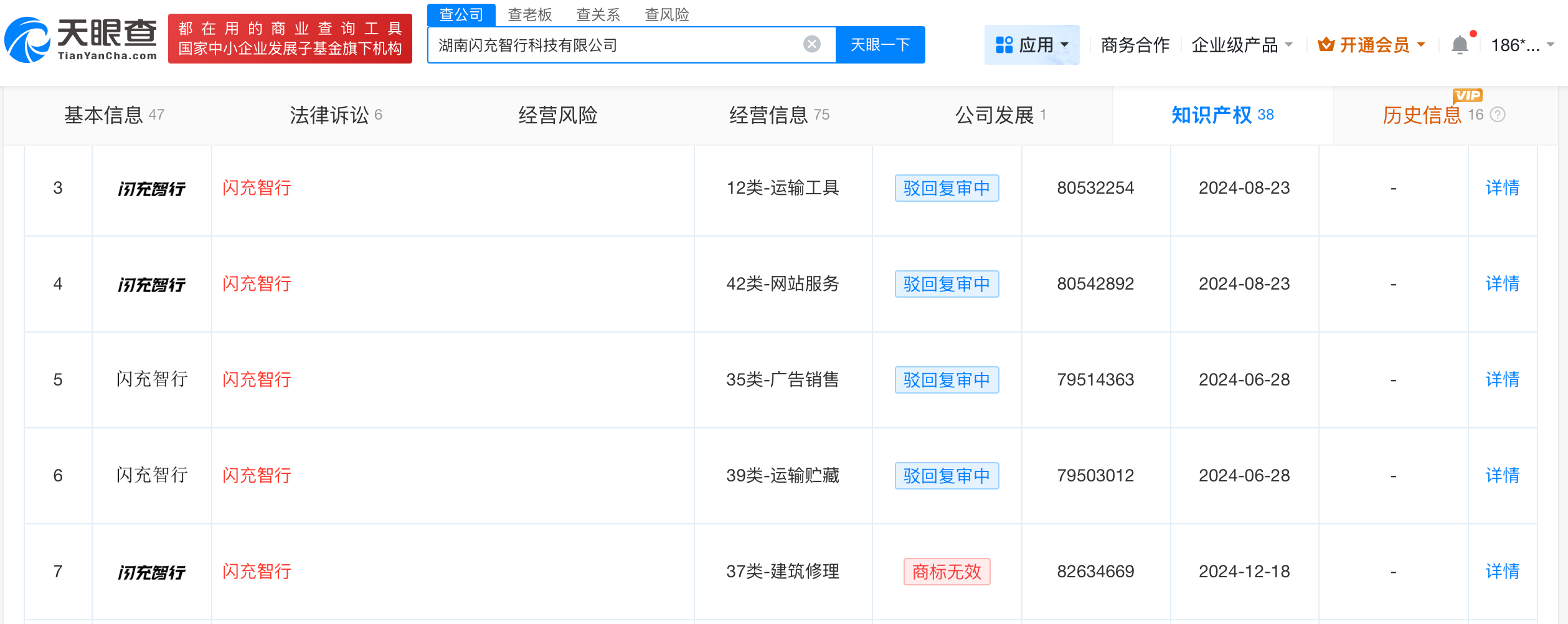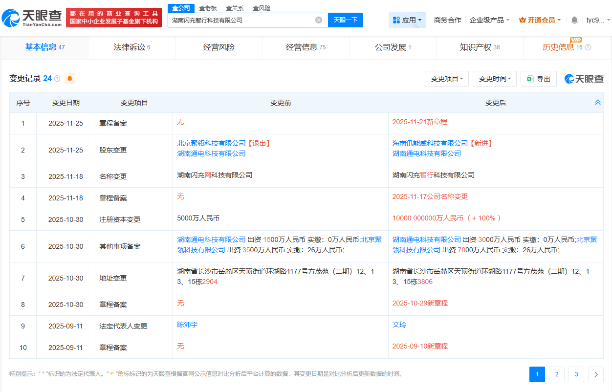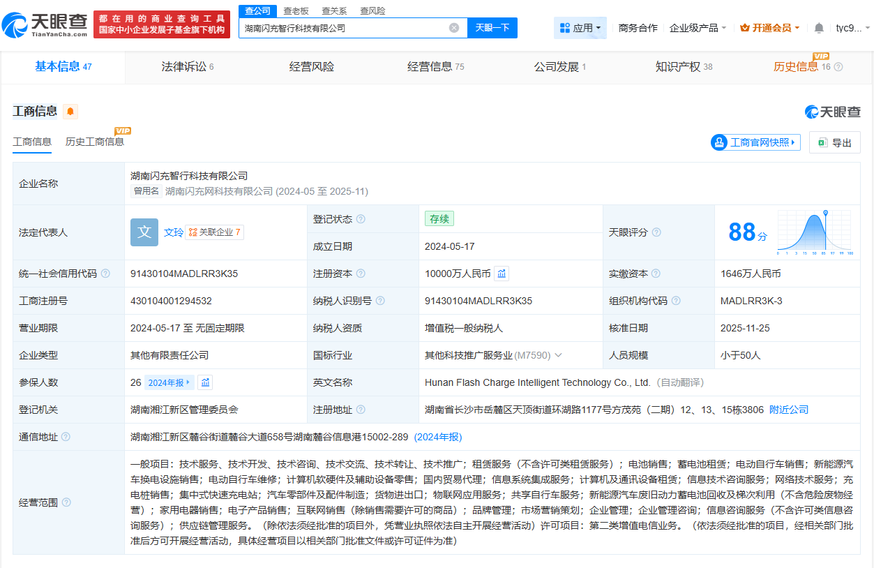 天眼查App显示,“闪充智行”关联公司湖南闪充智行科技有限公司成立于2024年5月,法定代表人为文玲,注册资本1亿人民币,经营范围包括电动自行车销售、新能源汽车换电设施销售、电动自行车维修、计算机软硬件及辅助设备零售等,由海南讯能威科技有限公司、湖南通电科技有限公司共同持股。变更记录显示,2025年10月,该公司注册资本由5000万人民币增资至1亿人民币,增幅100%。知识产权信息显示,该公司申请的多枚“闪充智行”商标申请已被驳回。