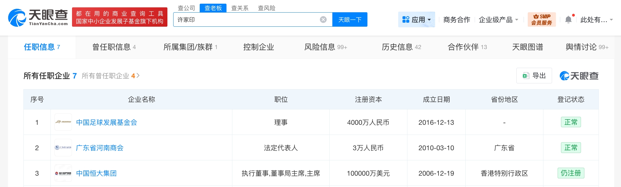 天眼查App显示,许家印目前仍关联多家企业或社会组织,其中3家为存续状态,除在港股上市的中国恒大集团外,还包括中国足球发展基金会、广东省河南商会,许家印担任理事等职务。另外3家企业恒大科技大学、深圳市全达贸易有限公司、广州安岛饮食娱乐有限公司,均已被吊销或注销。此外,曾任职信息显示,许家印曾担任恒大地产集团有限公司董事长。