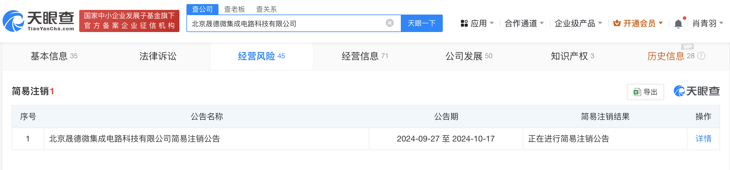天眼查App显示,近日,北京晟德微集成电路科技有限公司新增一则简易注销公告,公告期自9月27日至10月17日。