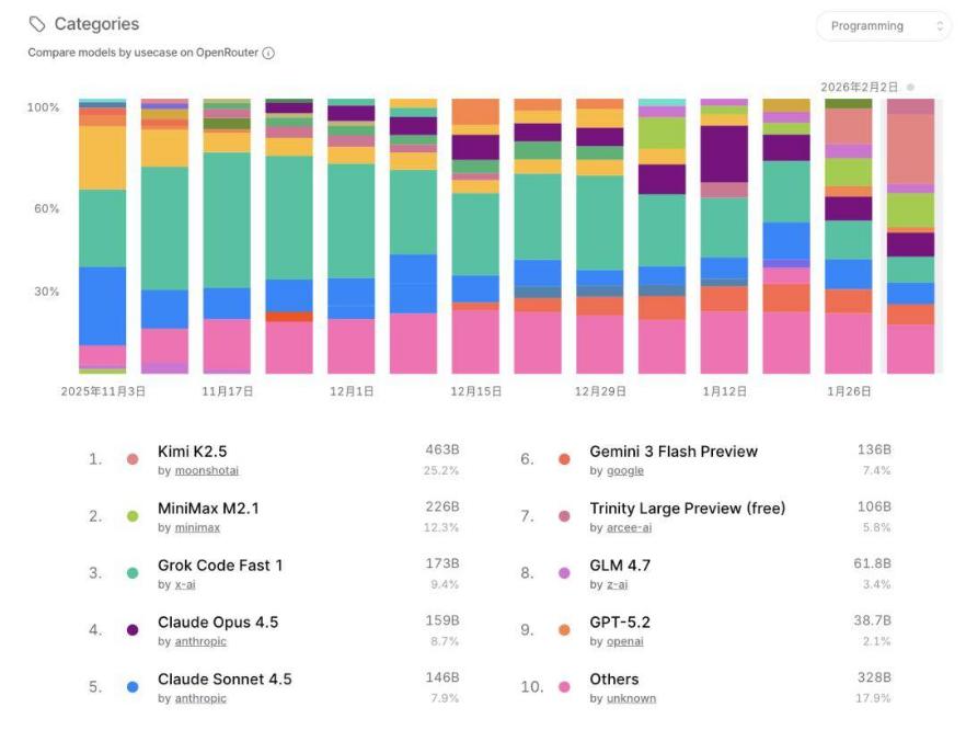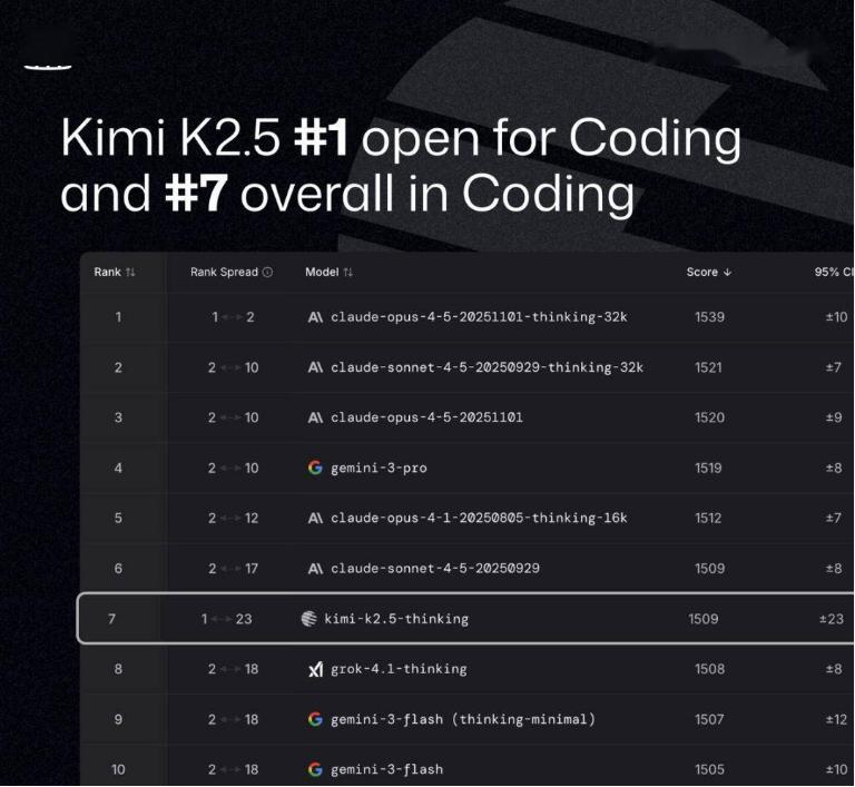 仅发布三天,Kimi K2.5模型便在海外知名编程工具Kilo Code,全球最大的众包AI设计平台Design Arena等多个平台拿到了调用量全球第一的成绩。