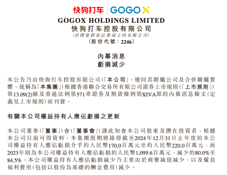 【TechWeb】3月20日消息,快狗打车发布公告,预期将录得截至2024年12月31日止年度的公司权益持有人应占亏损介乎约人民币1.7亿元至约人民币2.2亿元,而 2023年则为本公司权益持有人应占亏损约人民币10.996亿元,减少约80.0%至84.5%。亿公司权益持有人应占亏损减少乃主要由于商誉减值减少,以及雇员福利费用(包括以股份为基础的酬金费用)减少。