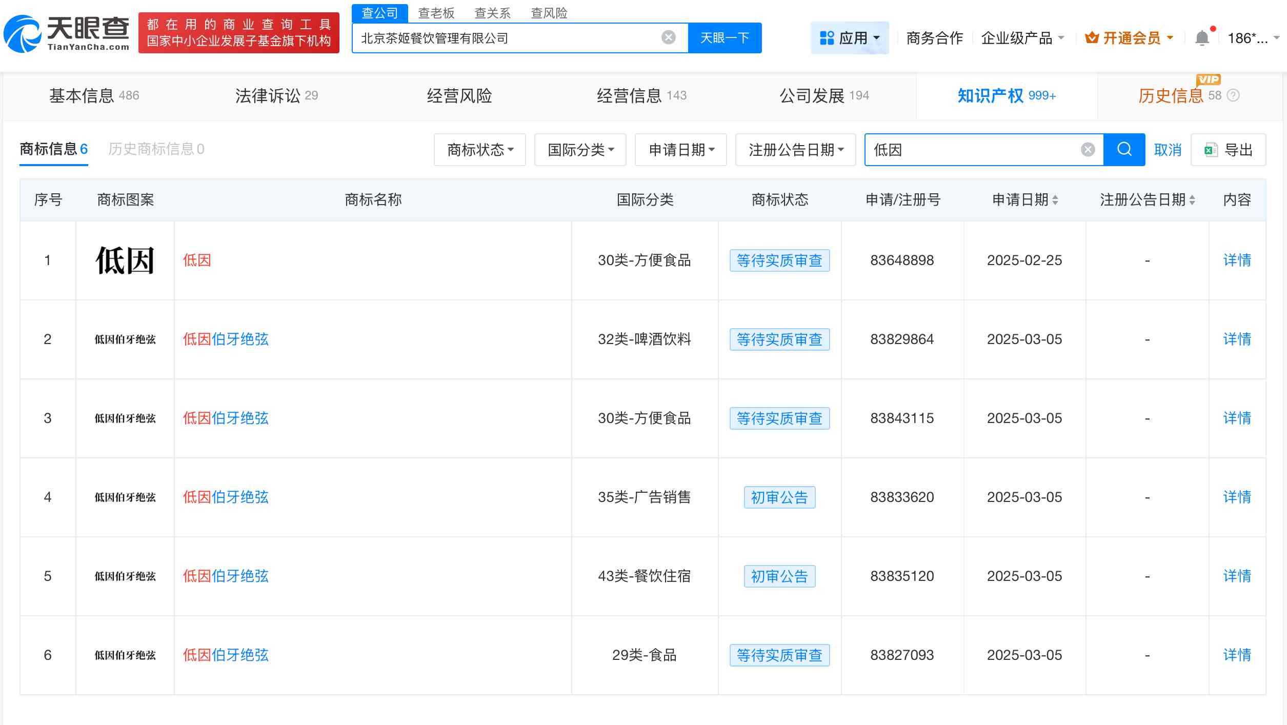 天眼查知识产权信息显示,北京茶姬餐饮管理有限公司曾于2025年2月至3月期间申请注册多枚“低因”“低因伯牙绝弦”商标,国际分类涉及方便食品、啤酒饮料等,上述商标状态多为等待实质审查。