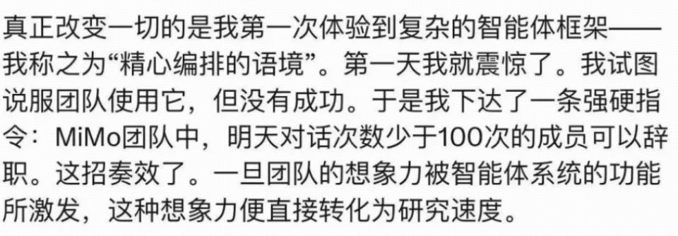 “我下达了一条强硬指令:MiMo团队中,明天对话次数少于100次的成员可以辞职。这招奏效了。一旦团队的想象力被智能体系统的功能所激发,这种想象力便直接转化为研究速度。”