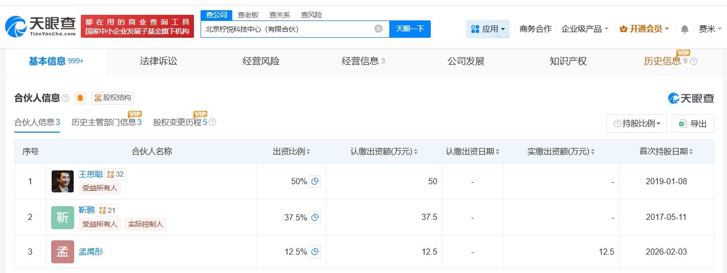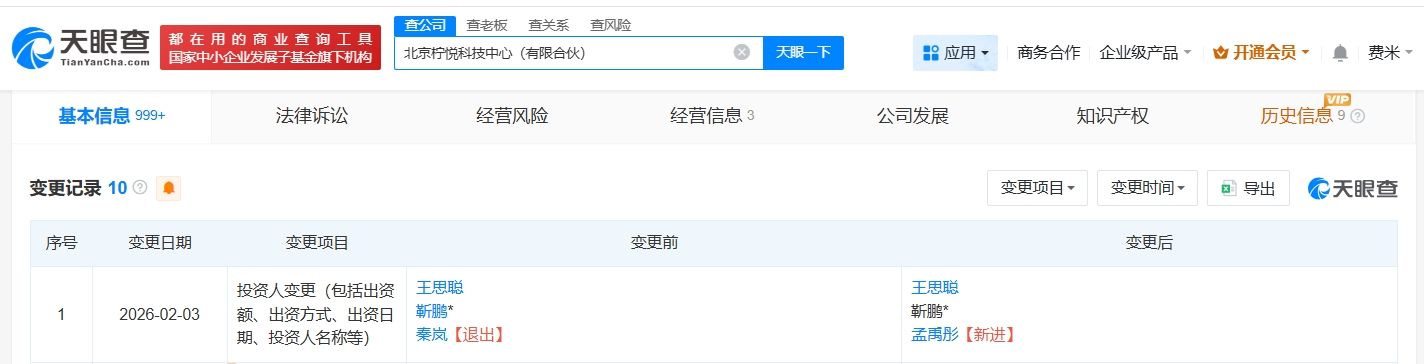 天眼查App显示,近日,北京柠悦科技中心(有限合伙)发生工商变更,原合伙人秦岚退出,新增孟禹彤为合伙人,退出前出资比例为12.5%。
