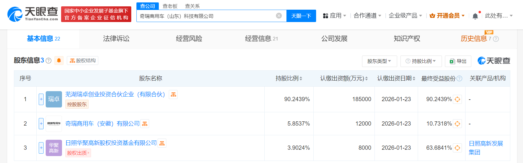 天眼查App显示,近日,奇瑞商用车(山东)科技有限公司发生工商变更,新增芜湖瑞卓创业投资合伙企业(有限合伙)为股东,同时,注册资本由2亿人民币增至20.5亿人民币。