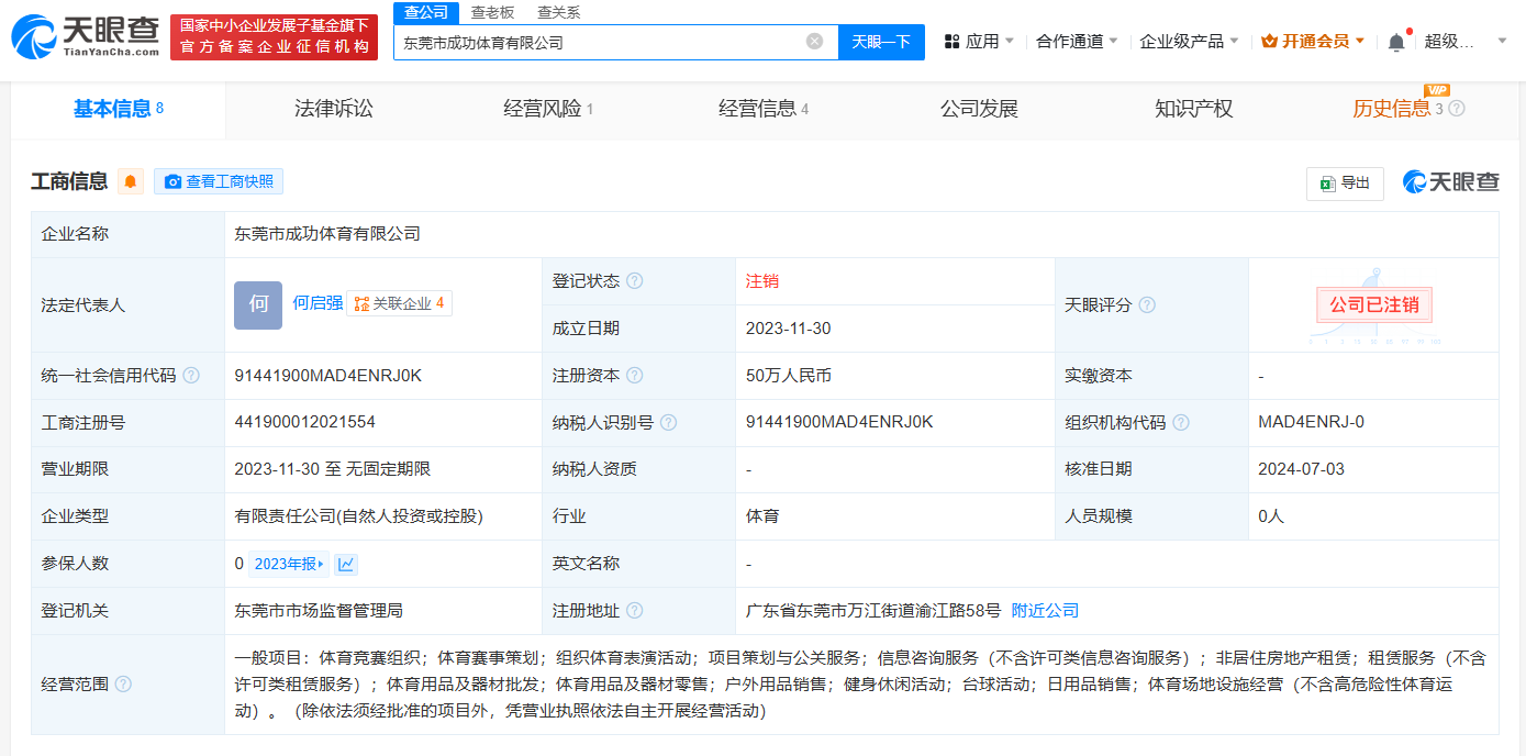 天眼查App显示,涉事的“成功V6羽毛球馆”关联公司东莞市成功体育有限公司已于今年7月注销,该公司成立于2023年11月,注册资本50万人民币,法定代表人、执行董事、经理为何启强,经营范围包括体育竞赛组织、健身休闲活动、体育场地设施经营等,由何启强、罗小容共同持股。