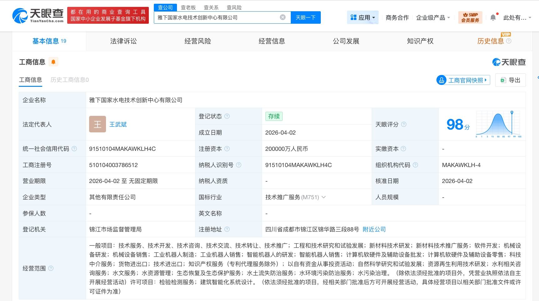 天眼查工商信息显示,近日,雅下国家水电技术创新中心有限公司成立,法定代表人为王武斌,注册资本20亿人民币,经营范围包括工程和技术研究和试验发展、水利相关咨询服务、水资源管理、检验检测服务等。