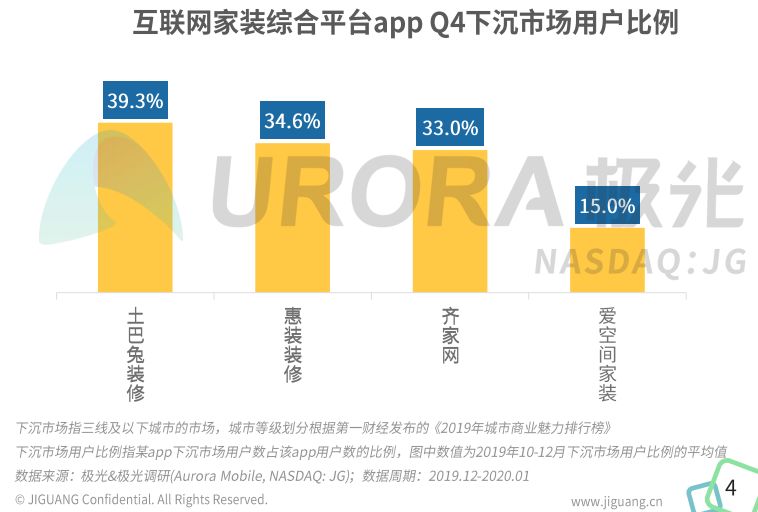 据近日极光发布的报告显示,在综合排名前四的综合家装平台中,土巴兔下沉市场用户比例达39.3%,位居第一;惠装装修、齐家网、爱空间家装分别位居第二到第四,其中爱空间家装的下沉市场用户比例为15%。