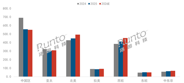 2024-2026E 全球投影机市场分区域出货量及预测