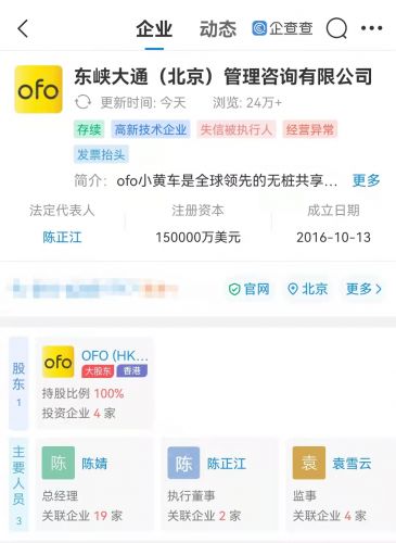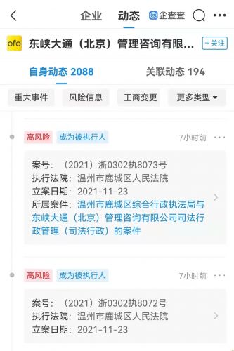 【TechWeb】企查查App显示,近日,ofo小黄车关联公司东峡大通(北京)管理咨询有限公司新增被执行人信息,执行标的共计5.5万元,关联案件为司法行政管理案。