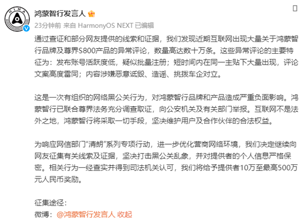 鸿蒙智行遭遇大规模网络黑公关,悬赏500万元人民币征集线索打击恶意评论汽车