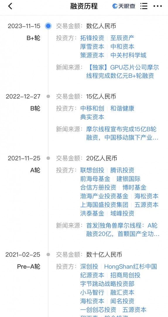 天眼查信息显示,摩尔线程成立至今已经完成了数轮融资,投资方包括五源资本、红杉中国、招商局创投、联想创投、字节跳动、小马智行、建银国际、中关村科学城、腾讯投资等知名国资和风投机构。