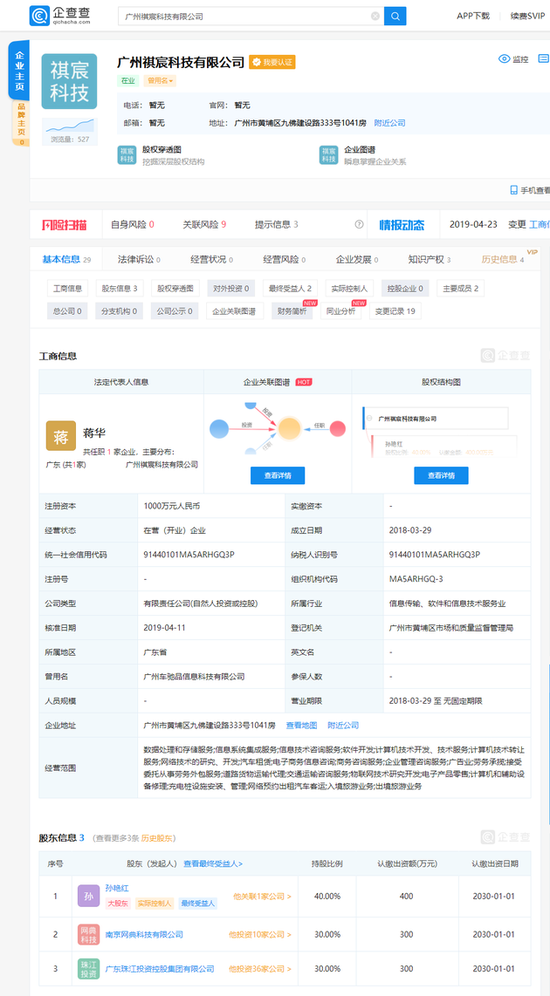 4月23日下午消息,企查查显示,4月23日,马化腾控股公司南京网典科技有限公司新增对外投资——广州祺宸科技有限公司,持股比例30%。