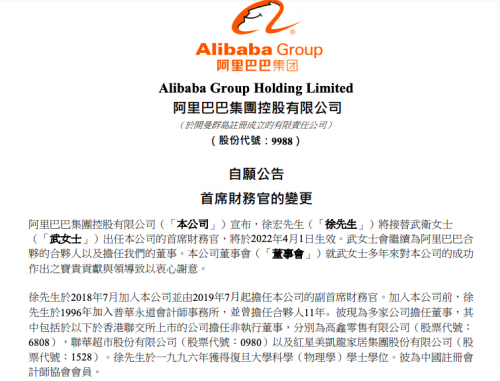 值得注意的是,在此次战略调整中,阿里管理层方面的接力也有了新的进展。2022年4月1日起,武卫(Maggie)将不再担任集团首席财务官(CFO),并由集团副首席财务官(副CFO)徐宏(Toby)接任。武卫将继续担任集团执行董事,并担任集团董事会下设的可持续发展委员会成员。关于CFO的接班计划,张勇表示几年前就和武卫开始筹划,并认为今天的交班条件已经成熟。