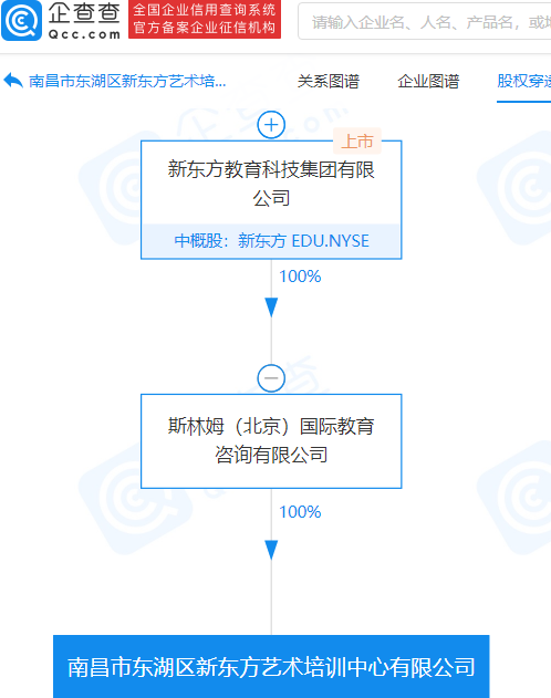 企查查股权穿透显示,该公司由斯林姆(北京)国际教育咨询有限公司100%控股,后者为新东方教育科技集团有限公司全资子公司。