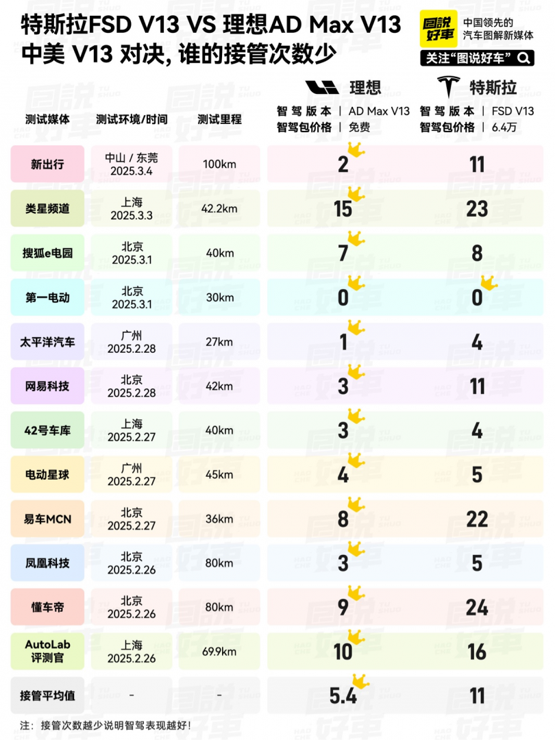 在所有的测试当中,理想智驾平均接管5.4次,特斯拉FSD接管11次。