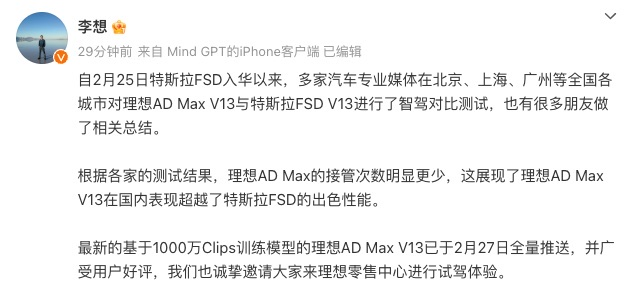 【TechWeb】3月5日消息,理想汽车CEO李想表示今日发文表示,自2月25日特斯拉FSD入华以来,多家汽车专业媒体在北京、上海、广州等全国各城市对理想AD Max V13与特斯拉FSD V13进行了智驾对比测试,也有很多朋友做了相关总结。
