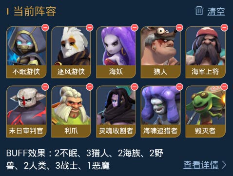 这也使2野兽+3猎人的buff不会比6猎人低太多,你都可以根据你的强力棋子决定场上的buff,比如前期可以用邪灵骑士凑双不眠buff、用独眼猎手凑3猎人buff、用任意战士凑三战士buff(这需要你对buff有一定的理解)。