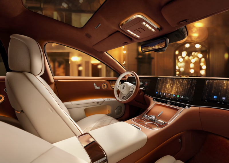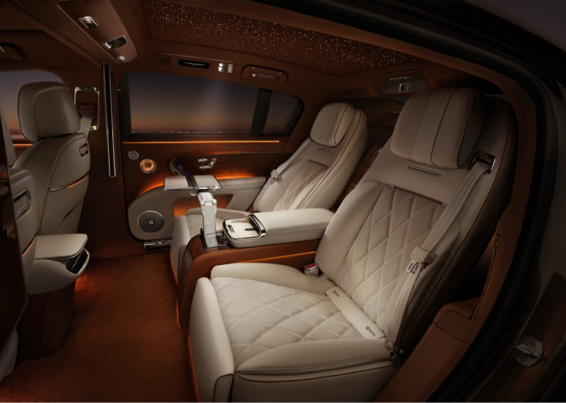 尊界S800的后排则更为奢华,首先可以看到与劳斯莱斯相似的星空顶的设计,后面还配备了可变色隐私玻璃与电动遮阳帘,可以更好的保护后排乘客的隐私。