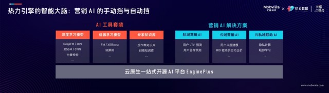 面对上述挑战,全球性技术平台汇量科技 Mobvista交出了答卷。9月15日,汇量科技携手热云数据发布由AI与云原生两种元素化能力驱动的全域营销云产品矩阵“热力引擎”。热力引擎搭载两个核心智能模块:以云原生一站式开源AI平台EnginePlus为内核的智能底座,以及面向营销增长场景深度打造的手动挡与自动挡营销AI智能大脑。智能底座+智能大脑的双技术组合,能很好地破解以上中小企业营销中运用AI技术面临的难题。