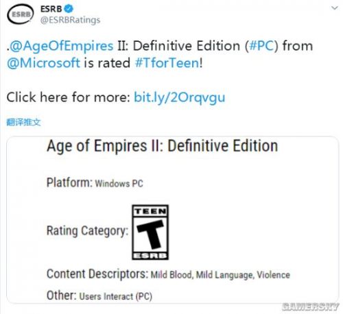 ESRB评级网站今日公布了《帝国时代2:终极版(Age Of Empires II:Definitive Edition)》的游戏评级。