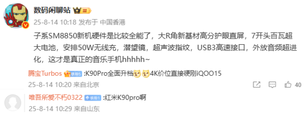 据知名数码博主@数码闲聊站 最新发布的信息显示,一款搭载SM8850(高通骁龙8 Elite 2)的子系迭代旗舰将采用大R角新基材高分护眼直屏,电池容量达到7000mAh级别,支持百瓦有线+50W无线充电。还有超声波指纹、USB3.0接口和音乐手机级的扬声器,硬件配置比较全能。结合此前相关爆料以及网友评论,该机大概率就是已经得到很多曝光的全新REDMI K90 Pro。除此之外,此前有爆料称该机将配备潜望长焦镜头,不过有网友猜测可能还是“祖传”的三星JN5镜头。