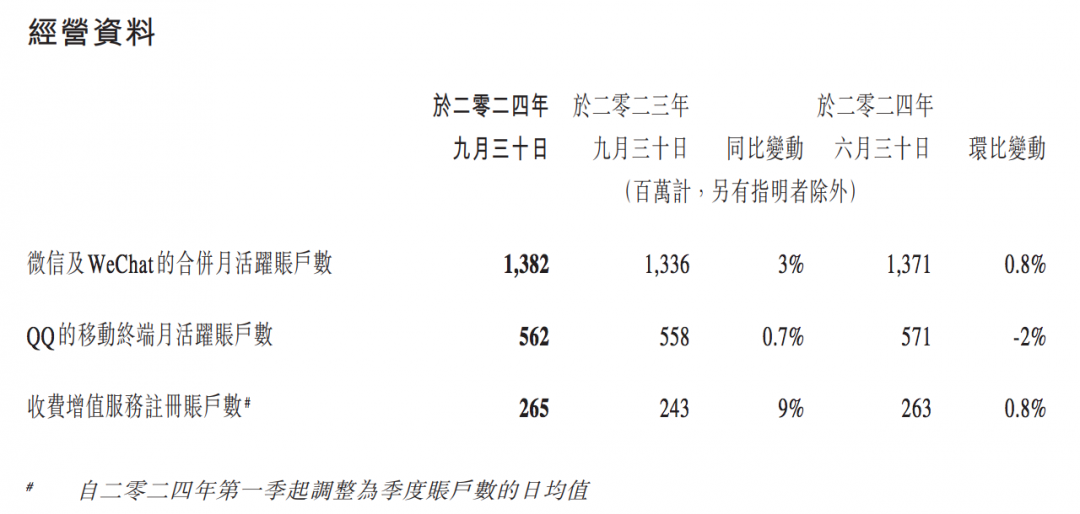 截至2024年9月30日,微信及WeChat的合并月活跃账户数为13.82亿,同比增长3%,环比增长0.8%。QQ移动终端月活跃账户数5.62亿,同比增长0.7%。