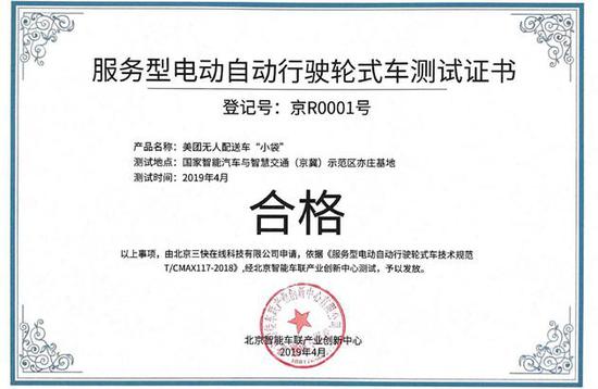 通过服务型电动自动行驶轮式车测试,本次通过测试的美团无人配送车,本次通过的测试依据全球首个轮式车标准——《服务型电动自动行驶轮式车技术规范 T/CMAX117-2018》。