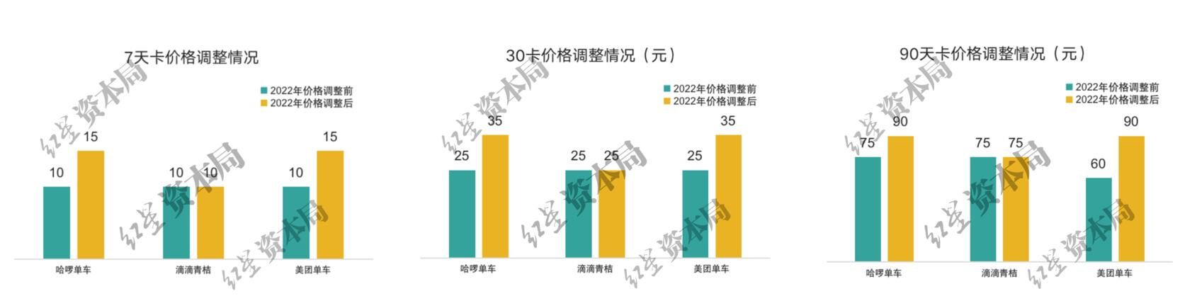 类似的情况也出现在套餐卡的调价上。依旧是来自于红星资本局的整理数据,哈啰单车和美团单车在2022年调整后的价格保持着惊人的一致。剔除美团90天卡调整前价格低于同行20%的因素之后,二者7天卡、30天卡、90天卡的涨幅分别50%、40%和20%,呈现出天数越多涨幅越低的特点。