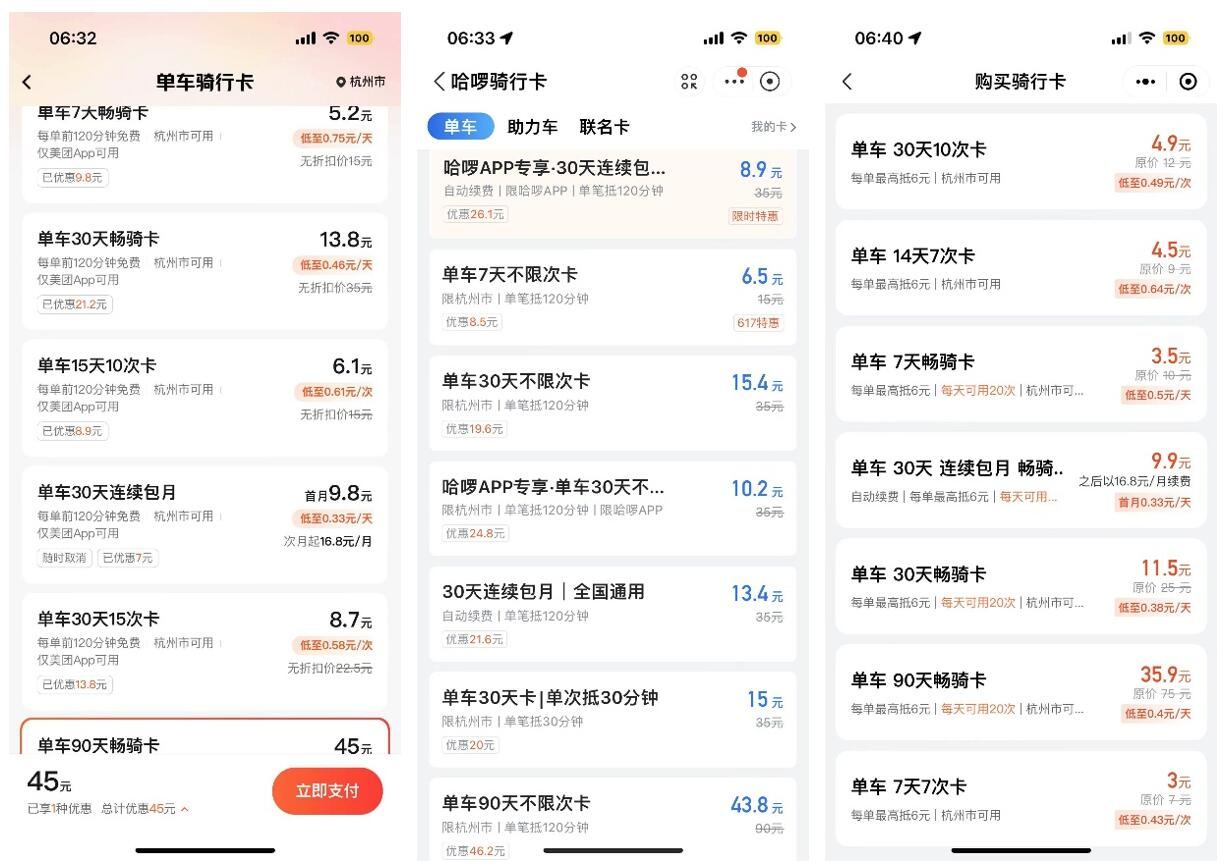 需要指出的是,天数卡只是基础价格上调,日常的优惠折扣仍然存在,也就是说用户购卡实际支付的要比基础价格低。从实测的结果来看,各家的优惠力度还不小。下图从左到右依次为杭州的美团、哈啰和青桔优惠价格,折扣在4-5折,有些甚至更低(不同手机、用户的页面价格可能不同,仅供参考)。