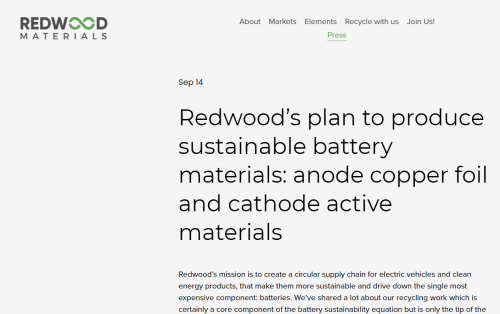 虽然Redwood公司现阶段主要业务是回收电池,但其周二的一篇博文中表示,计划在明年年初宣布新制造基地,目标是到2025年,每年为100万辆电动汽车生产100吉瓦时(GWh)电池所需的阴极活性材料 (CAM)。