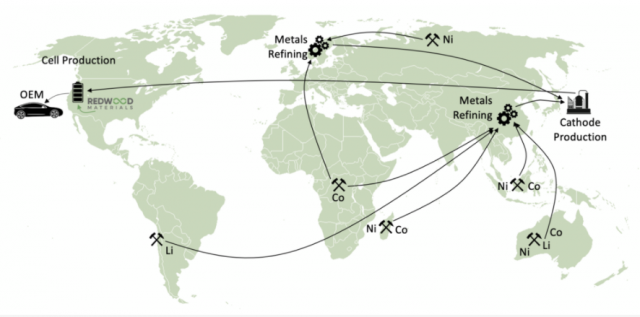“现有的电池供应链是一个错综复杂的系统,所需材料融入最终产品之前需要运输数万英里”,Redwood在博客中写道,复杂的物流增加了电池的整体成本和碳足迹。