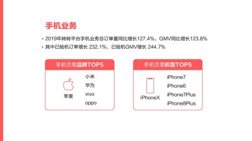 同时,转转服务白皮书数据显示,2019年转转公司整体收入增速超过100%,在手机、数码3C等核心品类上更是取得快速增长。整个2019年,转转平台手机业务总订单量同比增长127.4%,手机业务GMV同比增长123.8%,其中已验机订单增长232.1%,已验机GMV增长244.7%,已逐步成为大家进行二手手机交易的最主要渠道。