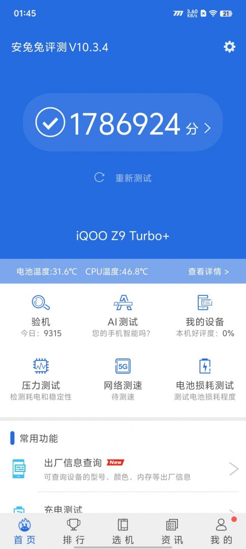 从结果来看,iQOO Z9 Turbo+的安兔兔跑分达到了1786924分,是当前同档位机型中属于非常顶尖的水平,实际使用起来也非常流畅。