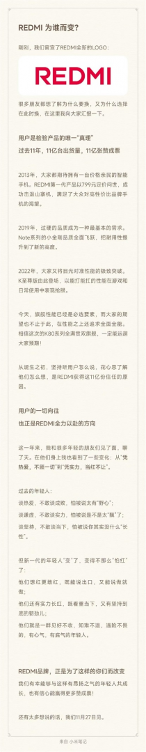 【TechWeb】今日,REDMI品牌迎来重大变革,正式启用全新的品牌标识,并同步预告备受瞩目的K80系列将于11月27日盛大发布。