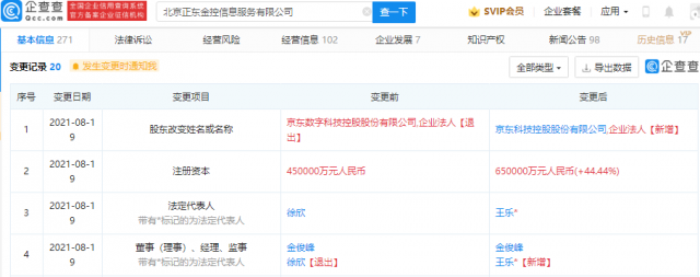 【TechWeb】企查查APP显示,8月19日,北京正东金控信息服务有限公司发生工商变更,公司注册资本由45亿元人民币增加至65亿元人民币,增幅44.44%。