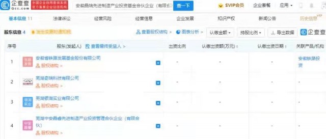 企查查股权穿透显示,该公司由芜湖奇瑞科技有限公司等共同持股。