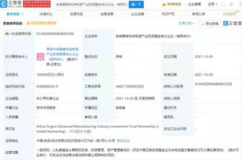 【TechWeb】企查查APP显示,10月29日,安徽晶瑞先进制造产业投资基金合伙企业(有限合伙)成立,执行事务合伙人为芜湖中安晶睿先进制造产业投资管理合伙企业(有限合伙),注册资本10亿元人民币,经营范围包含:以私募基金从事股权投资、投资管理、资产管理等活动。