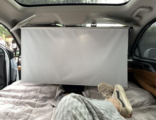 没错,P5主推卖点之一在于车内空间可以极大化利用——放平座椅,给床垫充好气,挂上遮光板,一台满足睡眠、休憩的“房车”就准备好啦。