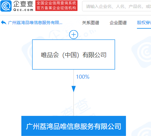 企查查股权穿透显示,该公司由唯品会(中国)有限公司100%控股。