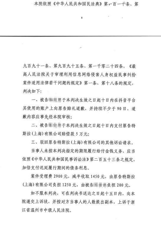 10月11日,特斯拉方面提供的一份文件显示,特斯拉(上海)有限公司(以下简称“特斯拉”)作为原告起诉被告温州车主陈某涉名誉权纠纷一案在一审中获得温州市鹿城区人民法院支持,法院判令被告向原告道歉,并赔偿损失5万元。