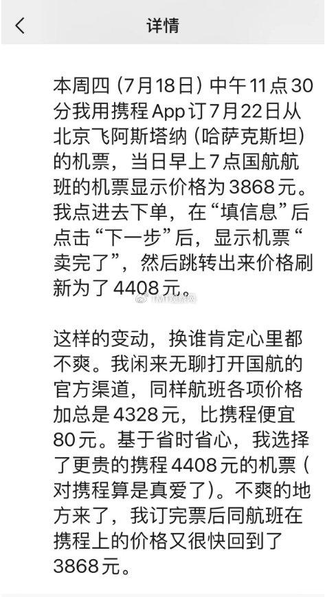 黄渊普分享了自己的亲身经历:7月18日中午,尝试通过携程App预订7月22日从北京飞往哈萨克斯坦的机票时,最初显示的国航早班机票价为3868元,但在填写完乘客信息准备下单的瞬间,页面显示机票售罄,价格随即调整为4408元。而在国航官方渠道,同样航班的总费用仅为4328元,比携程便宜了80元。