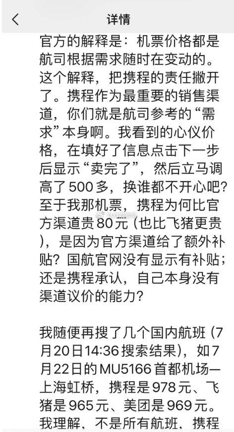 称其在使用携程App预订机票时遭遇大数据杀熟问题,携程显示的价格在填写信息后突然上涨,而相同航班的国航官方渠道价格较低。