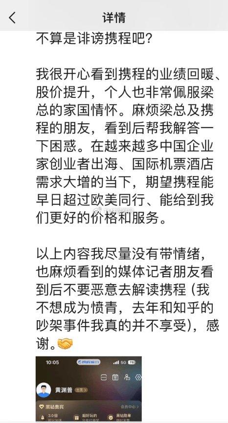 黄渊普质疑,携程作为主要销售渠道,是否真的具备价格优势。他还指出,即便作为携程最高等级的会员,他也并未获得价格上的优惠。他要求梁建章及携程团队对此给出解释。