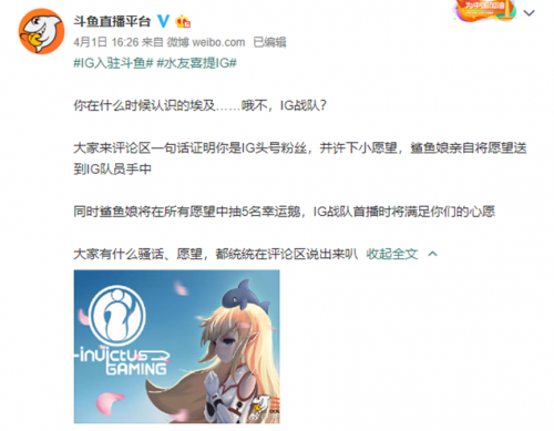 IG战队4月2日晚6点斗鱼开播 千万粉丝英雄联盟区狂欢快报