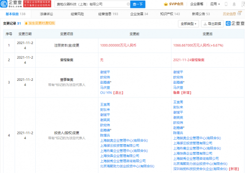 【TechWeb】企查查APP显示,11月24日,费勉仪器科技(上海)有限公司发生工商变更,新增华为关联公司深圳哈勃科技投资合伙企业(有限合伙)为股东,同时公司注册资本由1000万元人民币增加至1066.67万元人民币,增幅为6.67%。