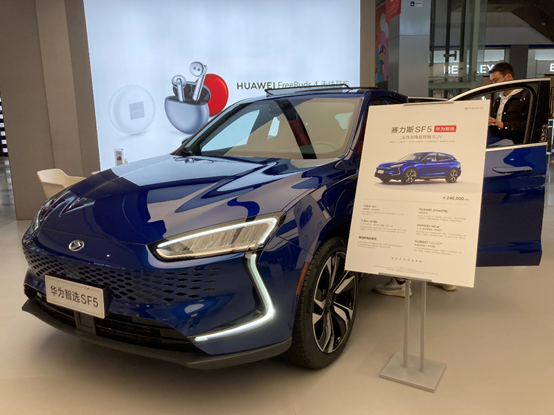 2021年4月,在上海南京路的华为全球旗舰店上,时任华为消费者业务CEO余承东正式宣布华为与金康赛力斯的合作,赛力斯SF5陆续进入华为5000多家门店进行销售。