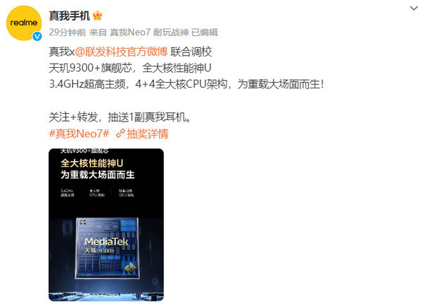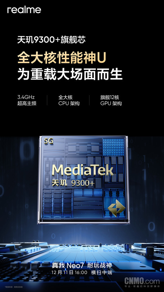 真我Neo7将搭载天玑9300+芯片:全大核神U 为重大场面而生快讯