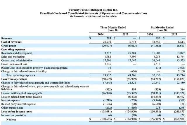 从其发布2024年半年度业绩报告来看,今年上半年FF累计实现营收29.5万美元;研发、销售成本大幅降低之下,净亏损由去年同期的2.70亿美元降至1.57亿美元(约合人民币11亿元);截至6月30日,该公司账面总资产约为4.58亿美元,总负债约为3.09亿美元,净资产约为1.49亿美元。