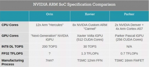 实际上,Orin的指数级提升根本原因在于芯片工艺的改良,Orin采用最新7nm工艺,整块SoC容纳下了170 亿个晶体管,并且在软件端集成英伟达下一代GPU架构和Arm Hercules CPU 内核,以及新的深度学习和计算机视觉加速器,实现性能较上一代 Xavier 7 倍提升。